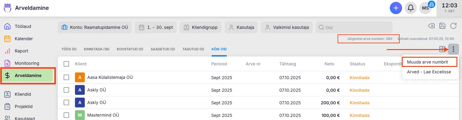 Section titled “Järgmise arve numbri määramine”Kui tuled teiselt süsteemilt või soovid numbrijada jätkata: