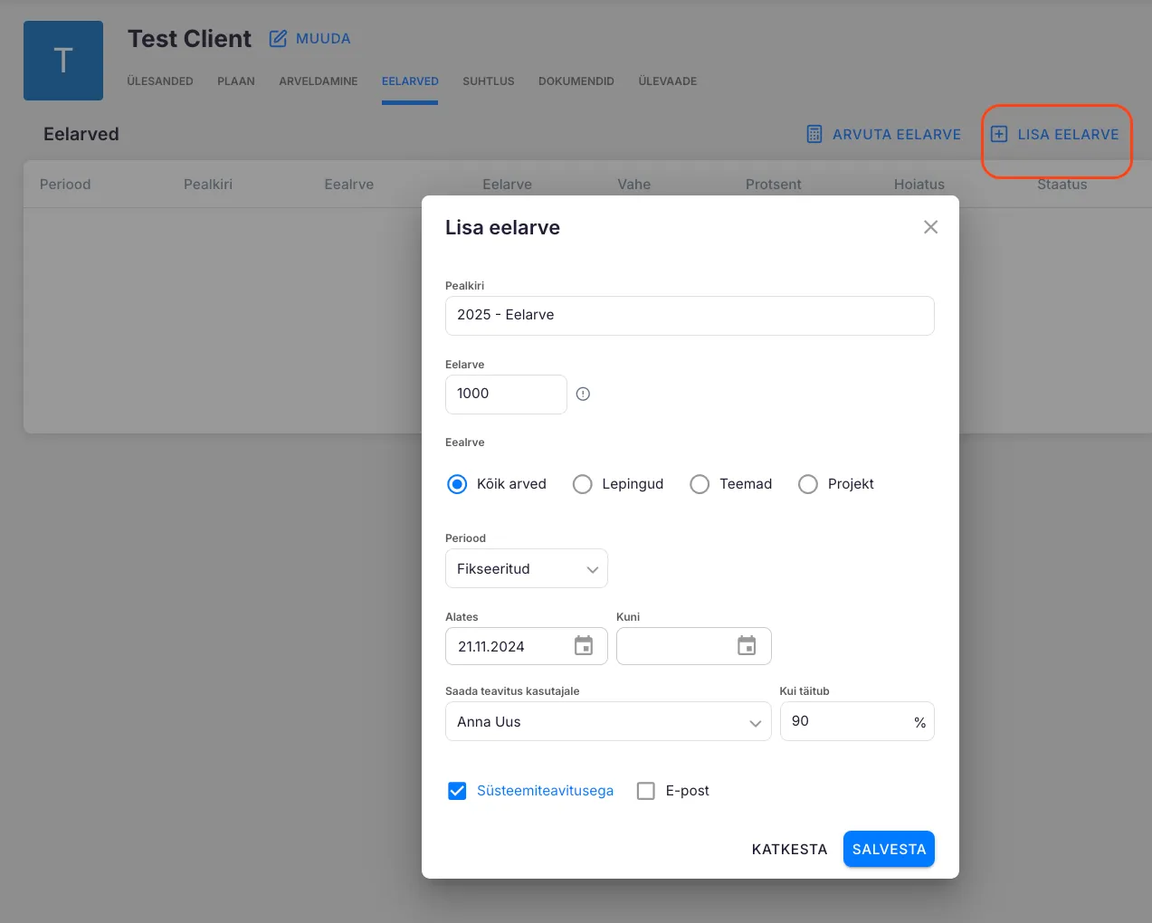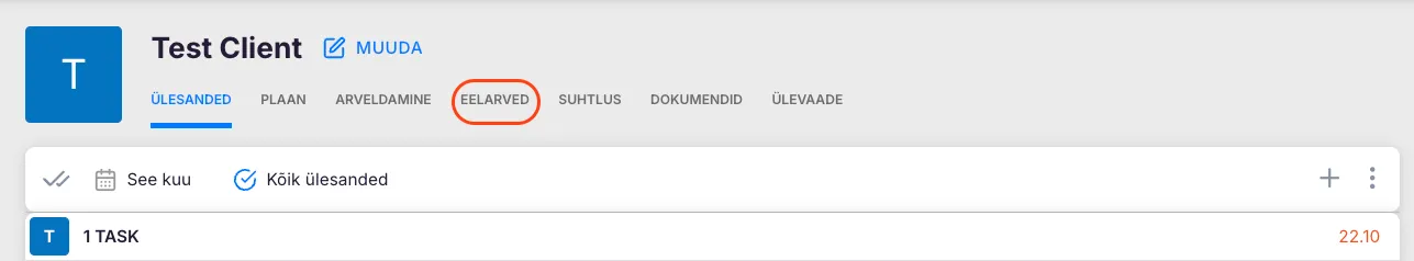 Section titled “Eelarve Lisamine”Liigu Kliendi kaardi lehele.