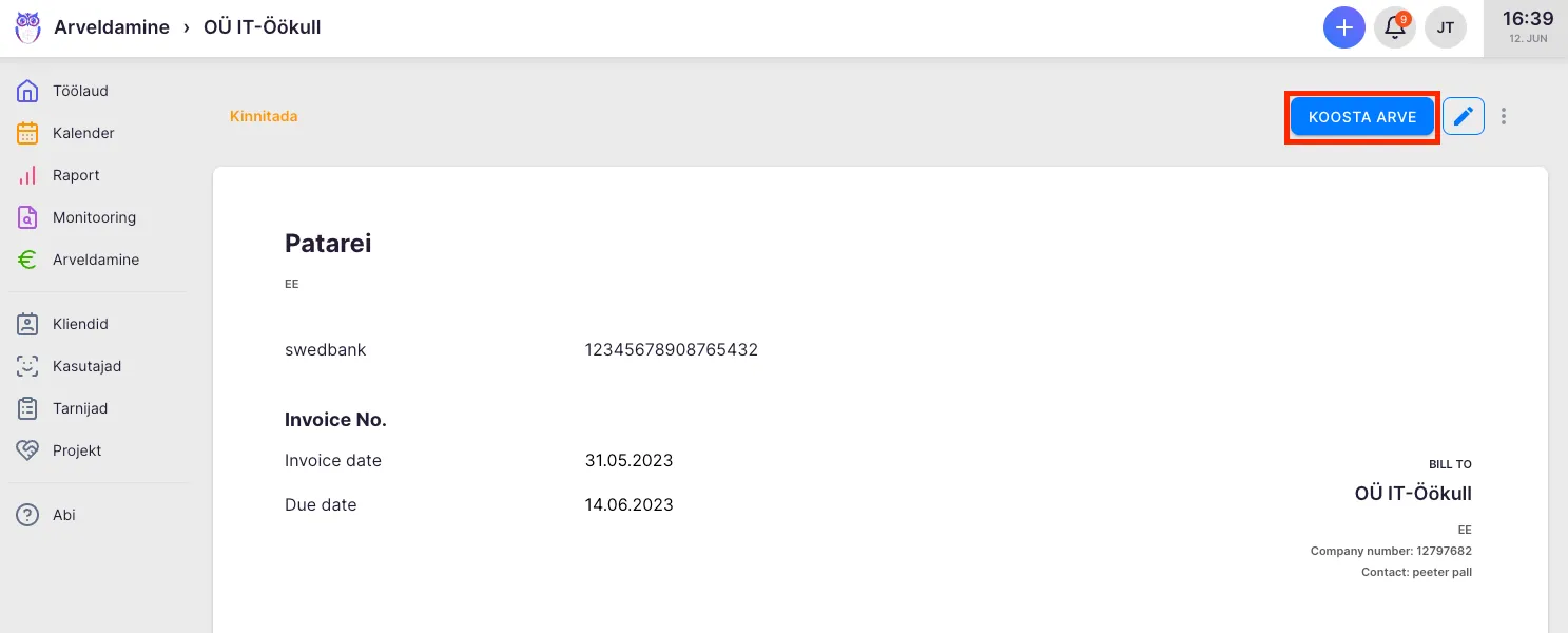 Section titled “Arvete koostamine ja saatmine”Peale kliendilepingu koostamist ja kinnitamist saad ülevaate jooksva ning lõppenud perioodi arvetest “Arveldamine” lehelt.