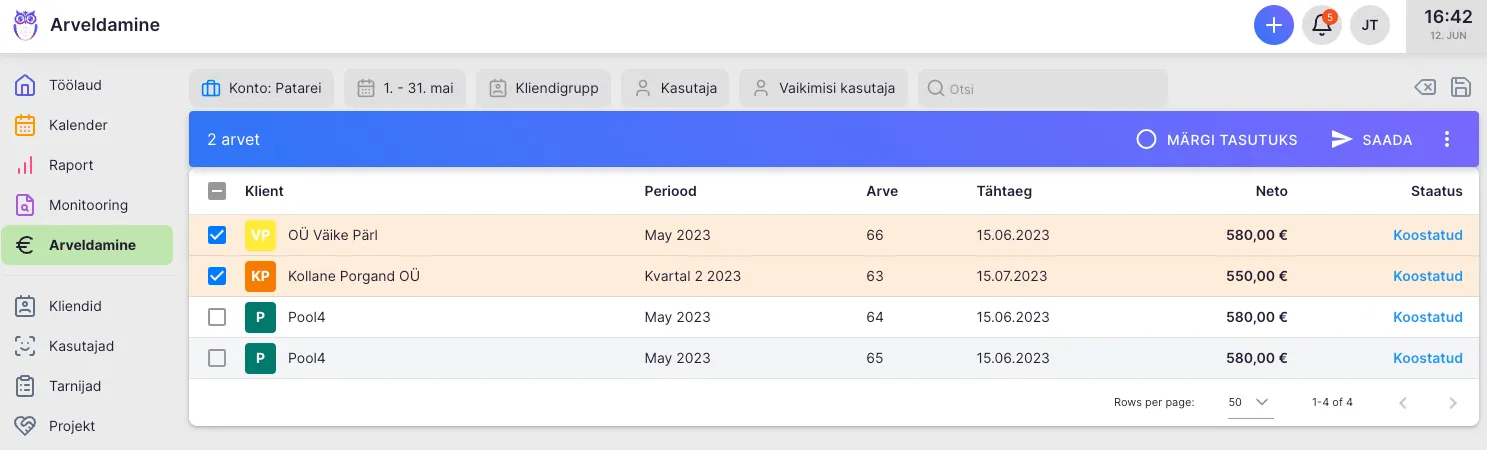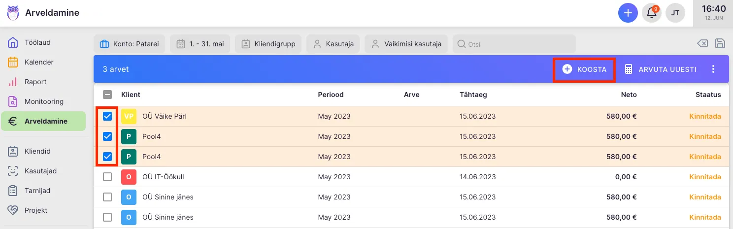 Kui oled veendunud et kõik on korrektne, koosta arved. Seda saad teha ühe kaupa või hulgitööriistaga, märkides vastavate klientide ette linnukese.