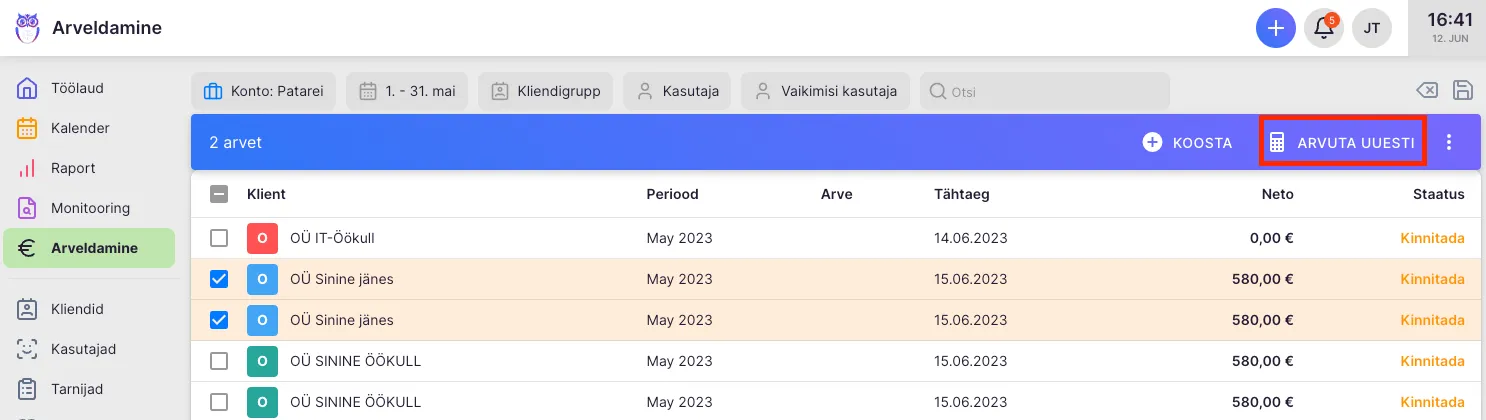 Kliki linnukesel kliendi nime ees ning vali päisest “Arvuta uuesti”. Tehes seda mitmele arvele korraga võib see võtta mõne hetke.
