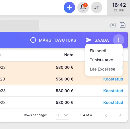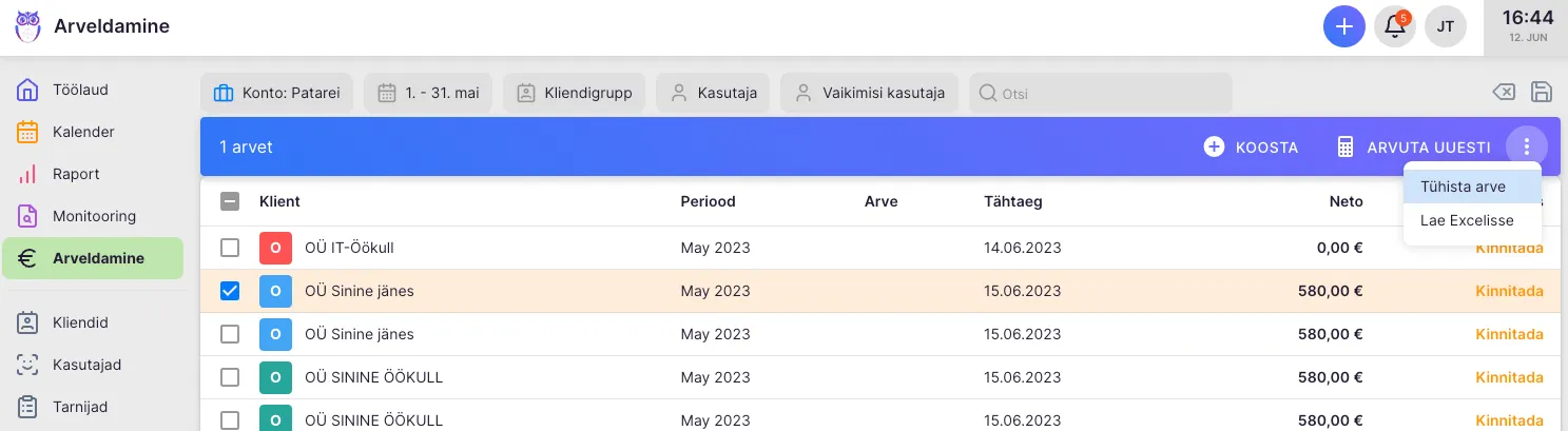 Section titled “Arve tühistamine”Arve tühistamiseks linnuta see arvete nimekirjas või ava arve ning tühista see.