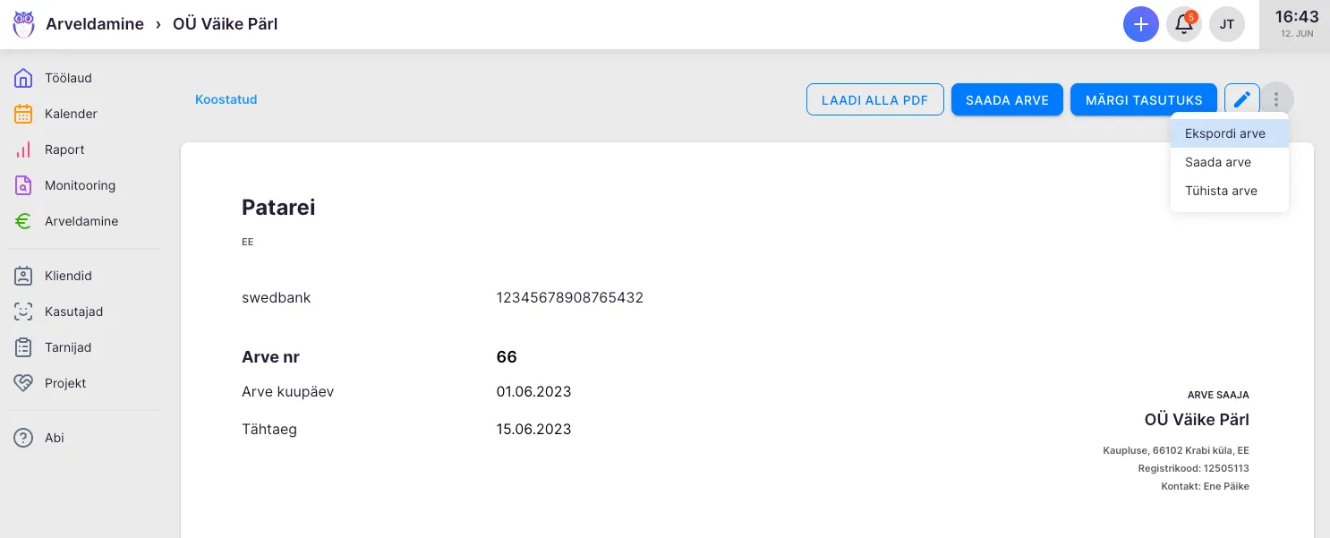 Lisaks sellele, et arve saadetakse kliendile e-postile saab arveid eksportida raamatupidamisprogrammi või Excelisse. Arveid on võimalik ka tühistada.