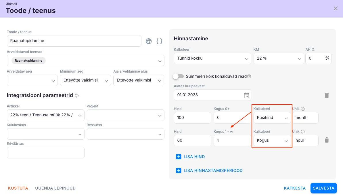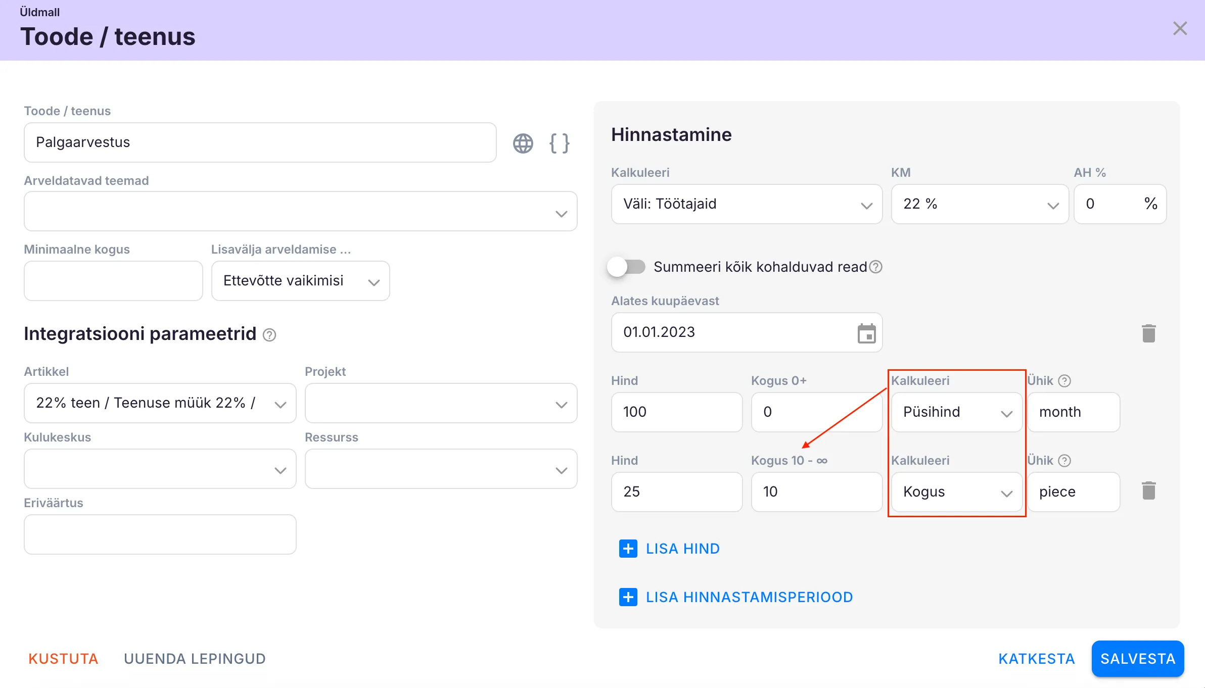 Section titled “Tükipõhine toode”Sellisel juhul on hind alati fikseeritud teatud koguseni ja kui fikseeritud hinnaga kogus ületatakse, lisandub sellele tükihind.