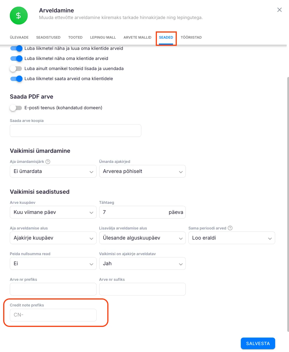 Kui automaatne kreeditarve prefiks ei sobi, saab seda mugavalt muuta arvelduse seadetes.