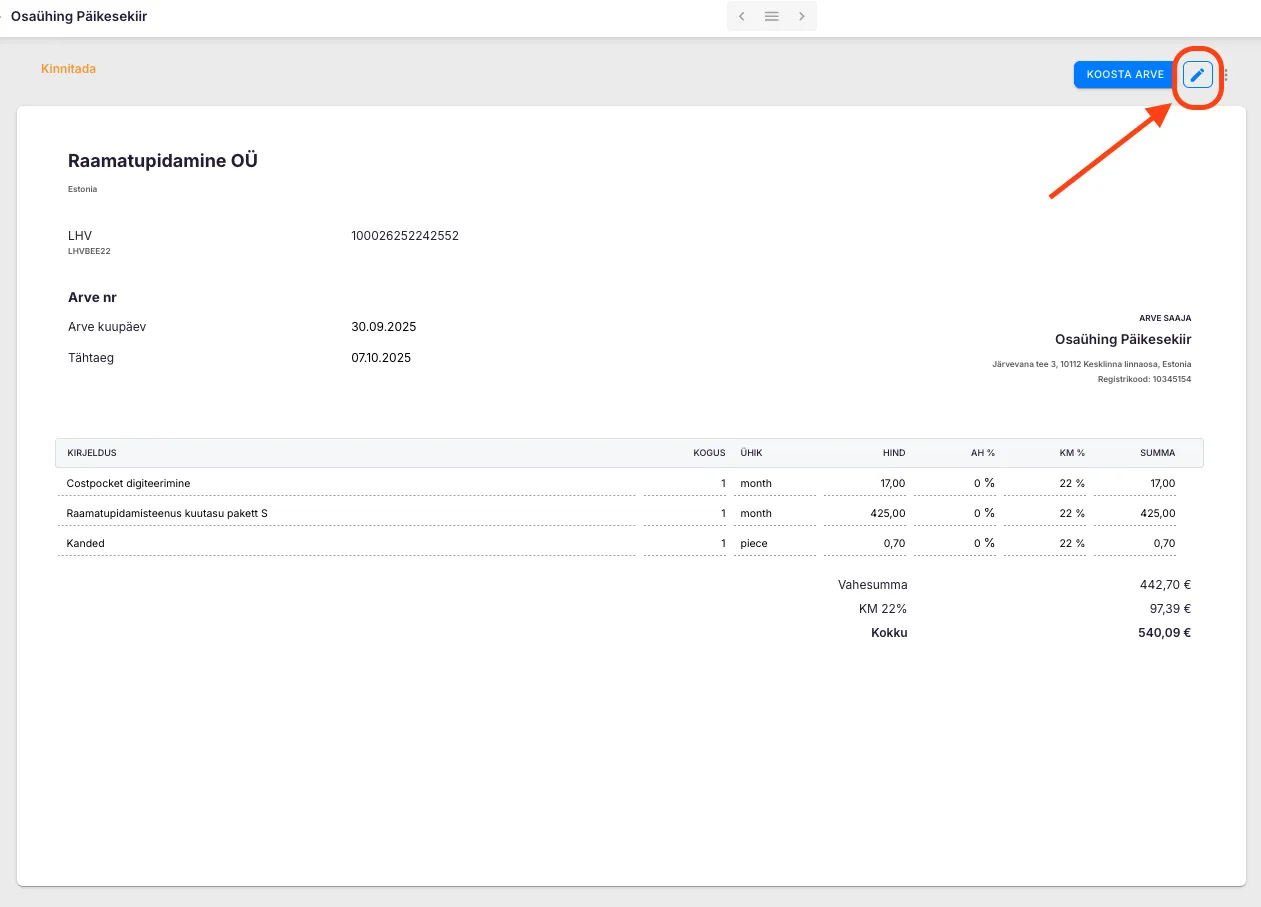 Arveid saab muuta, kui need ei ole veel kinnitatud ega saadetud kliendile. Mine Billing rakendusse, ava arve ning tee vajalikud muudatused. Kui arve on juba kinnitatud, tuleb see esmalt tühistada ja luua uus.