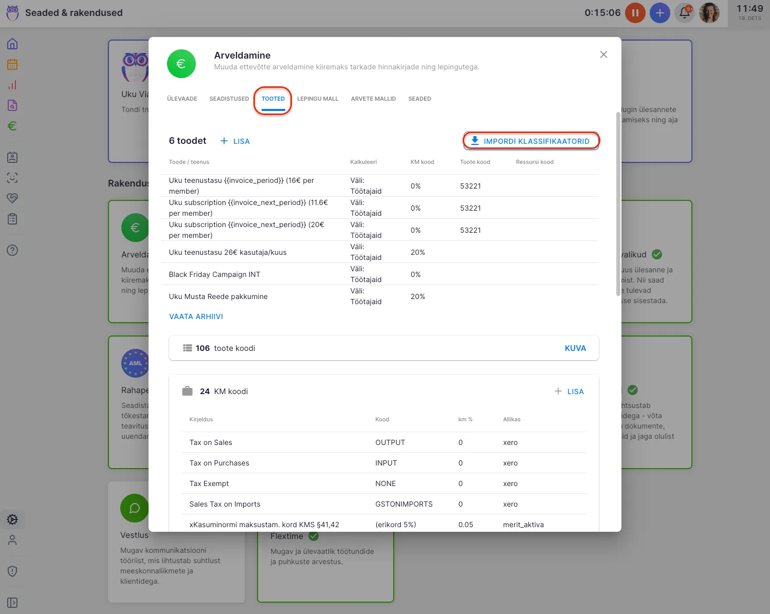 NB! Enne kui alustad käibemaksumäärade muutmisega, kontrolli kas sul on vastavad õigused. Arveldamise seadete all võib piirata kellele on lubatud teostada toodete muutmist, sealhulgas ka käibemaksumöörade muutmist.
