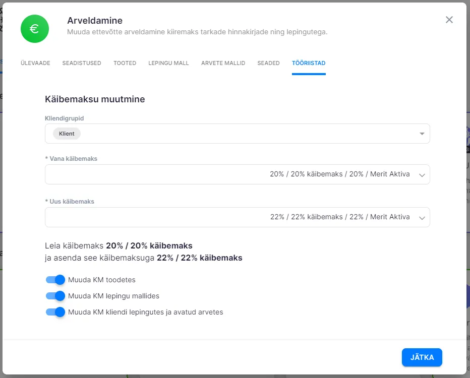 - Vali muudetav KM määr ja uus määr, millega soovid seda asendada.