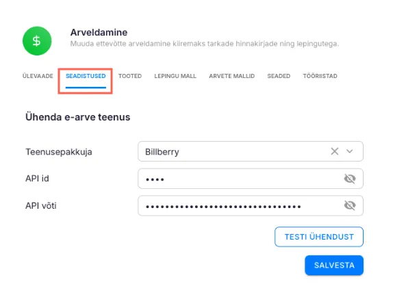 - Täida kõik vajalikud väljad (nt API võti, kasutajanimi jms – vastavalt teie Billberty integratsiooni juhendile).