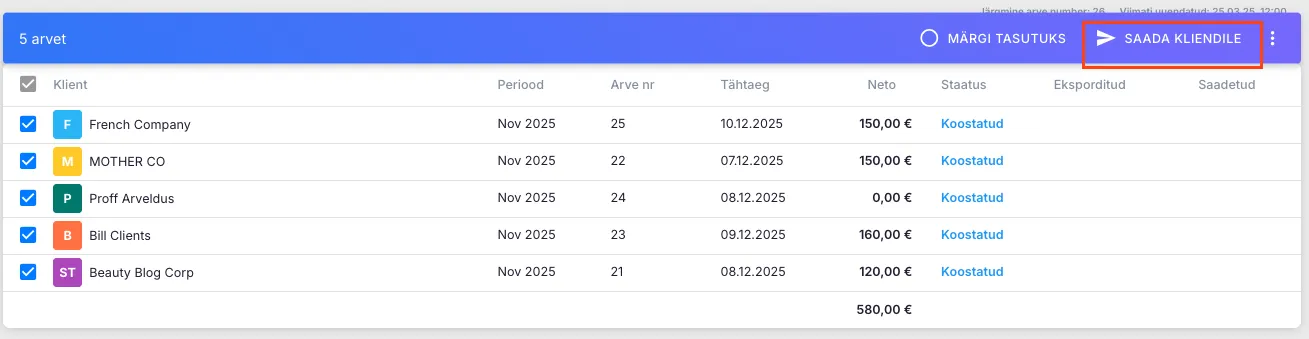 Sina valid Ukus ainult arvete nimekirjast arved ja klõpsad „Saada kliendile“ – ülejäänu otsustavad süsteemid ise vastavalt seadistustele.