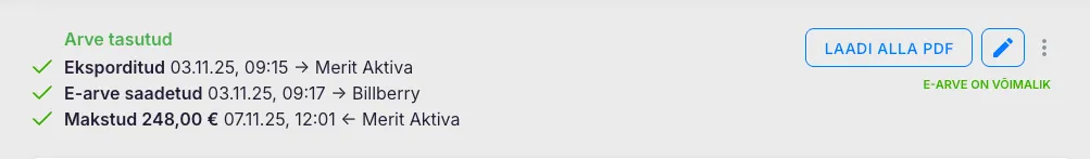 - Arve kõrval kuvatakse info, mis viisil arve saadeti (nt e-arvena, e-kirjaga PDF, mõlemad).