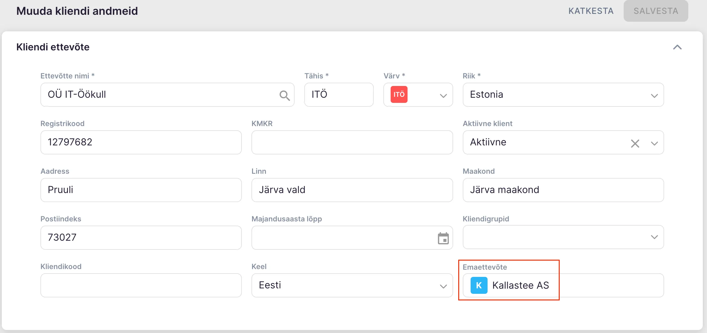 Esmalt vali tütarettevõtte muutmise vaates, milline on tema emaettevõte