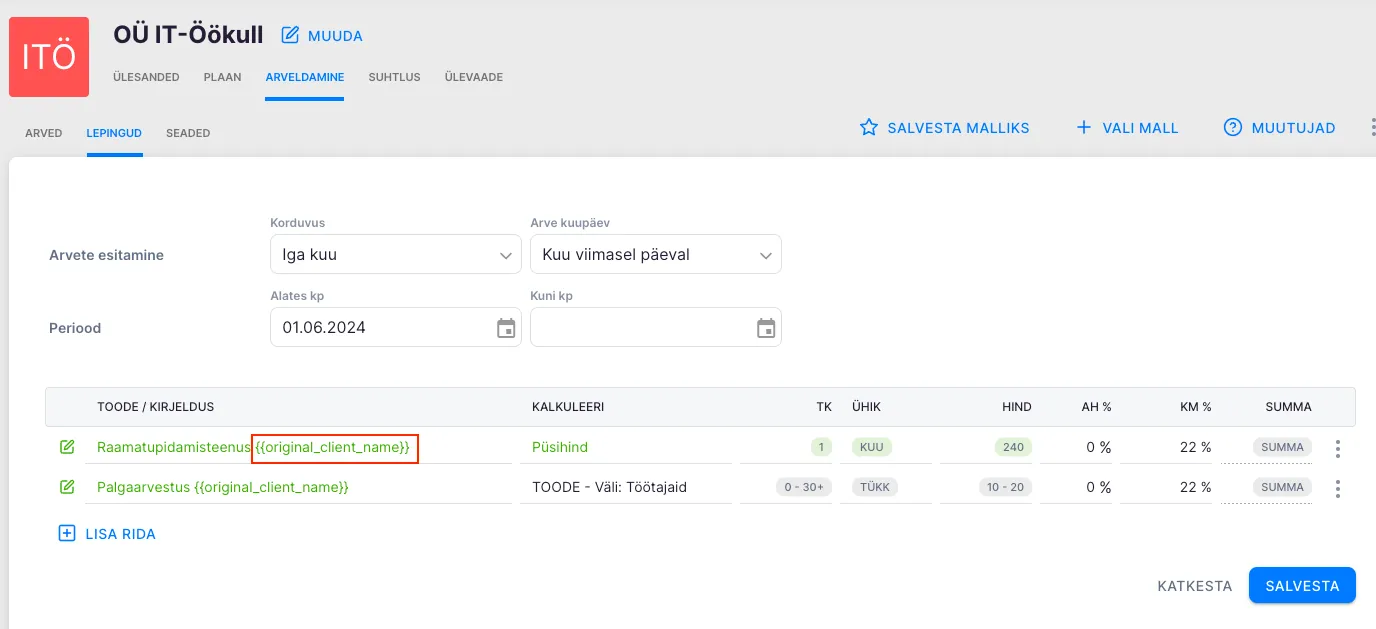 Soovi korral lisa tütarettevõtte lepingu toodetele parameeter {{original_client_name}}, mis kuvab arvereal välja kliendi nime