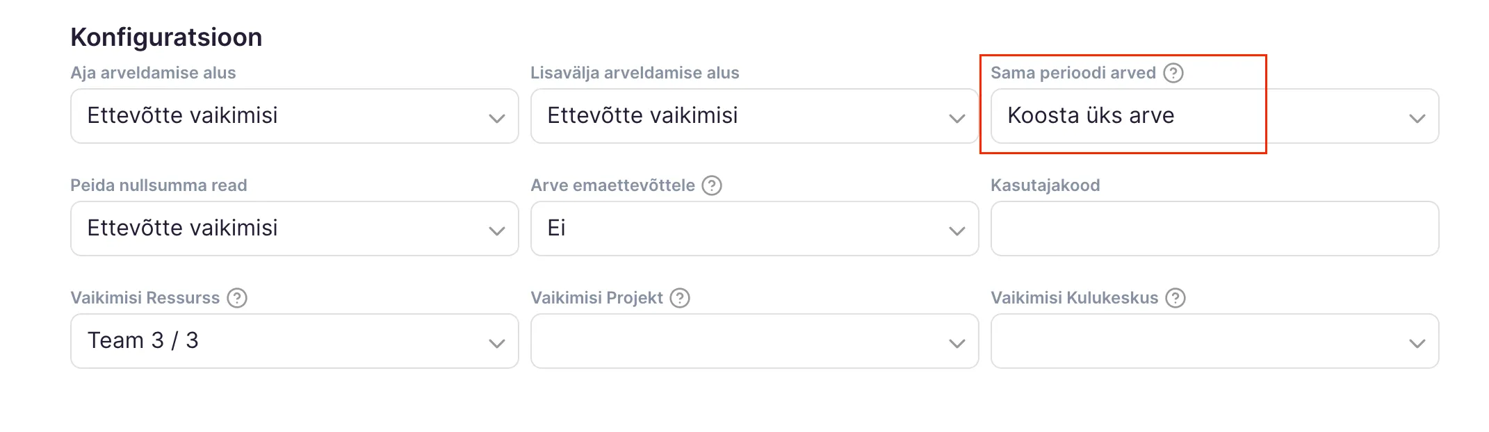 Kui on soov, et neist koostataks üks arve, siis vali emaettevõtte arveldamise seadetes, et sama perioodi arvetest koostataks üks arve.
