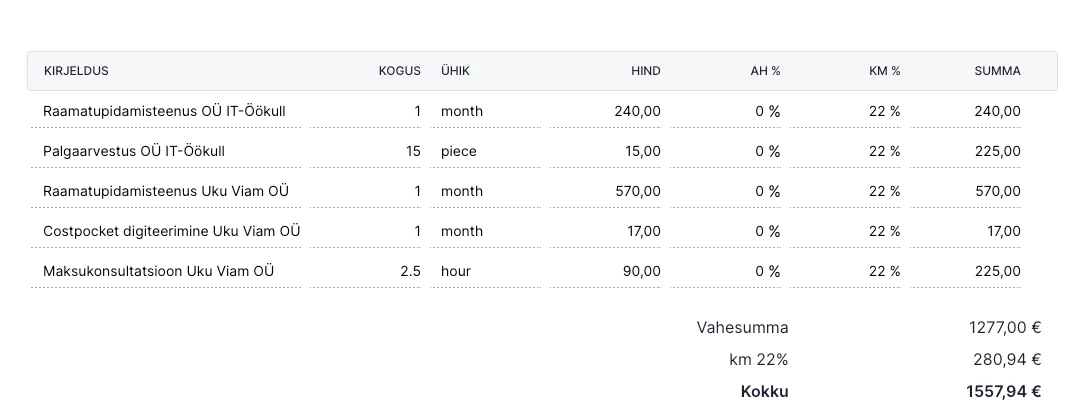 Section titled “Arveldamine ema- ja tütarettevõtetega”Palju on ettevõtteid, kellel on tütarettevõtted. Raamatupidamises osutatakse teenust nii ema- kui ka tütarettevõtetele, kuid arve esitatakse tihti emaettevõttele.