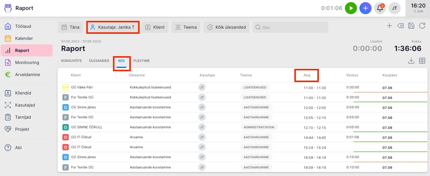 - Raporti vaates vali ülemisest menüüst “Aeg”.