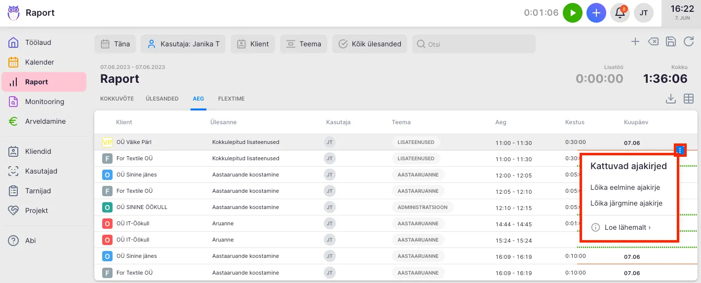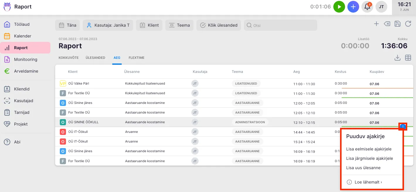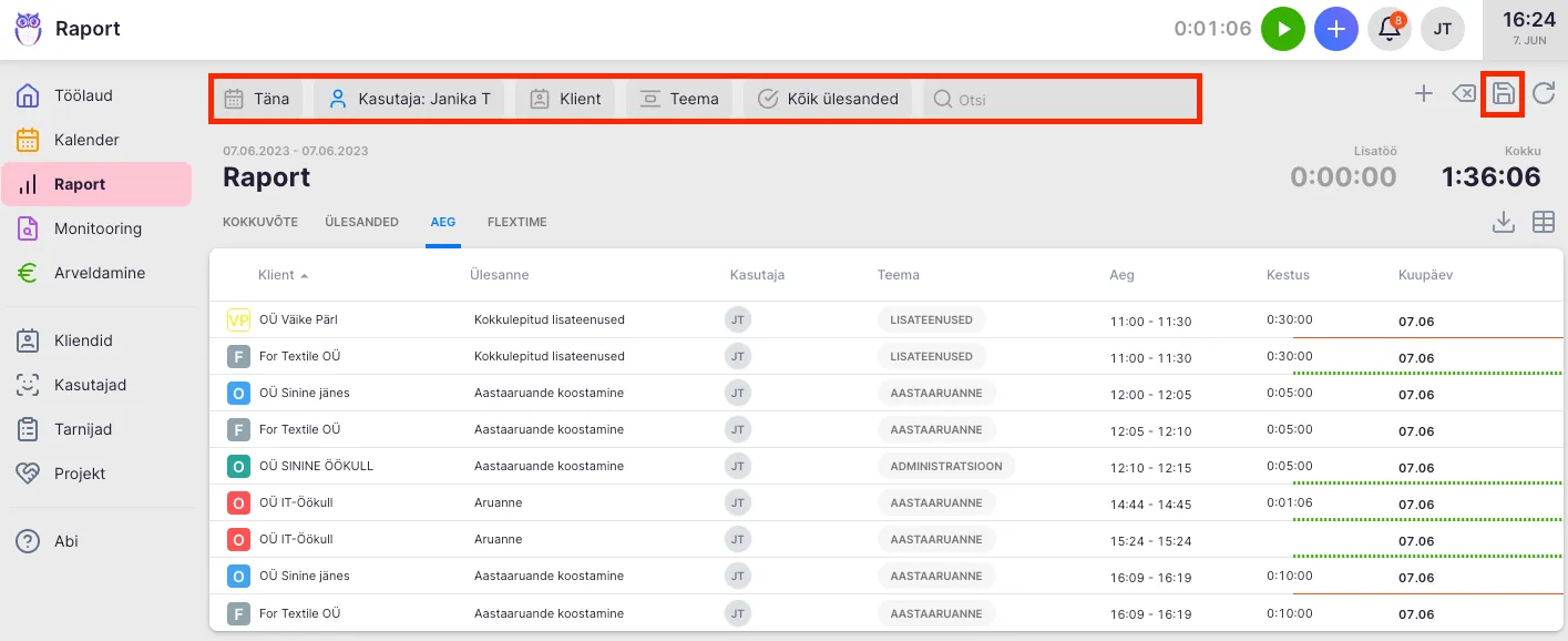 Kontrolli iga päeva lõpus üle, kas raportis on ajakirjed korrektsed. Nii ei pea kuu lõpus mõistatama, mida konkreetsel päeval tegid. Kiiresti õigesse vaatesse jõudmiseks salvesta filtrivalik. Selleks lisa kõik õiged andmed filtritesse ja vajuta disketi ikoonil. Loe lähemalt filtrite kohta.