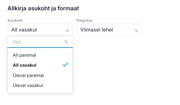 Seejärel klõpsa rippmenüüle Asukoht ja vali sobiv koht, kus allkiri peaks dokumentidel paiknema. Järgmisena vali Paigutus rippmenüüst ja otsusta e-allkirja paigutusviis dokumentidel.