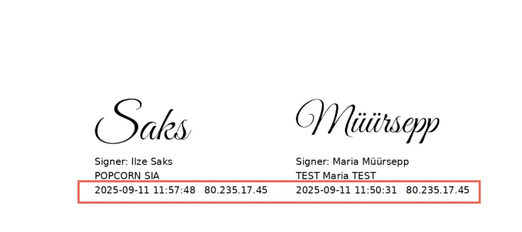Kui mõlemad lisafunktsioonid on aktiveeritud, kuvab e-allkiri dokumentidel allkirjastaja nime, allkirjastamise kuupäeva ja kellaaja ning allkirjastaja IP-aadressi.