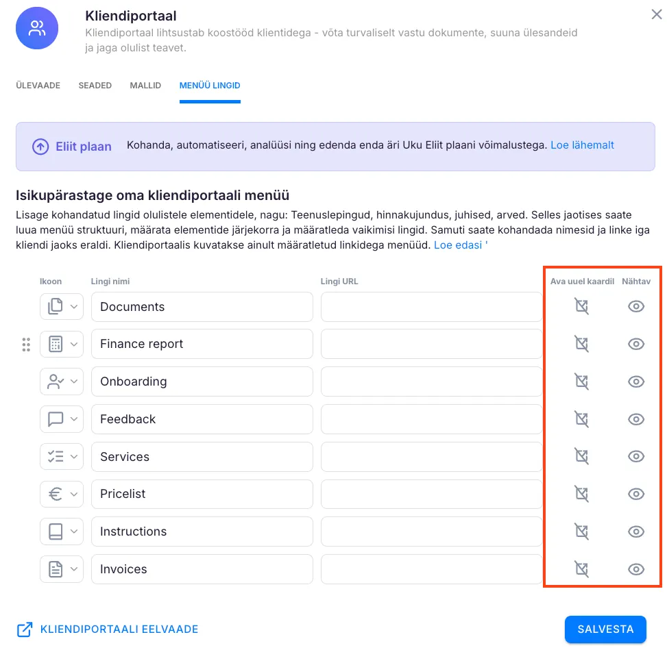 Määra ise, milline sinu kliendiportaali menüü välja näeb, lisa menüüpuntkidele nimed, ikoonid ja link, kuhu menüüpunkt viib.