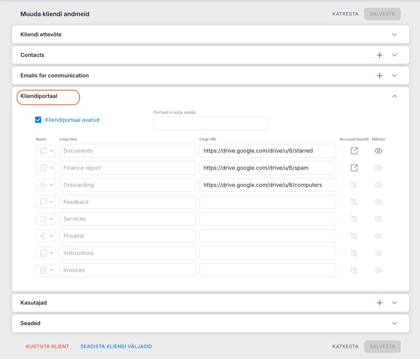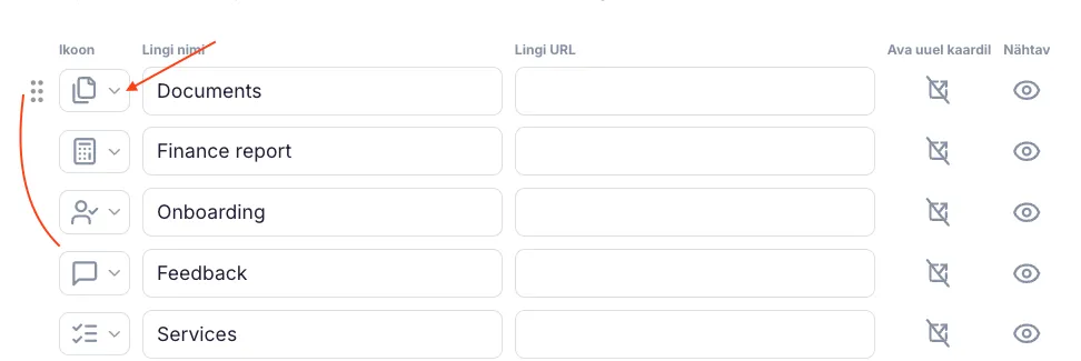 Siin saad valida, millised ikoonid ja võimalused on kliendi jaoks nähtavad. Kui soovid, et vastav aken oleks avatud uuel kaardil, aktiveeri rea lõpus ikoon “Ava uues aknas”. Kui soovid, et mõni väli ei oleks nähtav, klõpsa silmakujulisele ikoonile aktiveerimiseks või välja lülitamiseks.