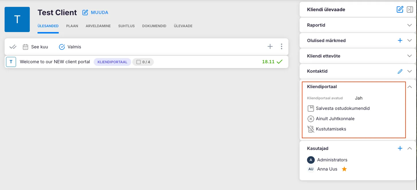 Eraldi kliendikaardil saad ikoonid ning nimetused muuta ja seadistada, arvestades kliendi ja raamatupidaja koostöö eripära. Selleks vali klient -> Muuda ning kliendi andmetes otsi “Kliendiportaal”.