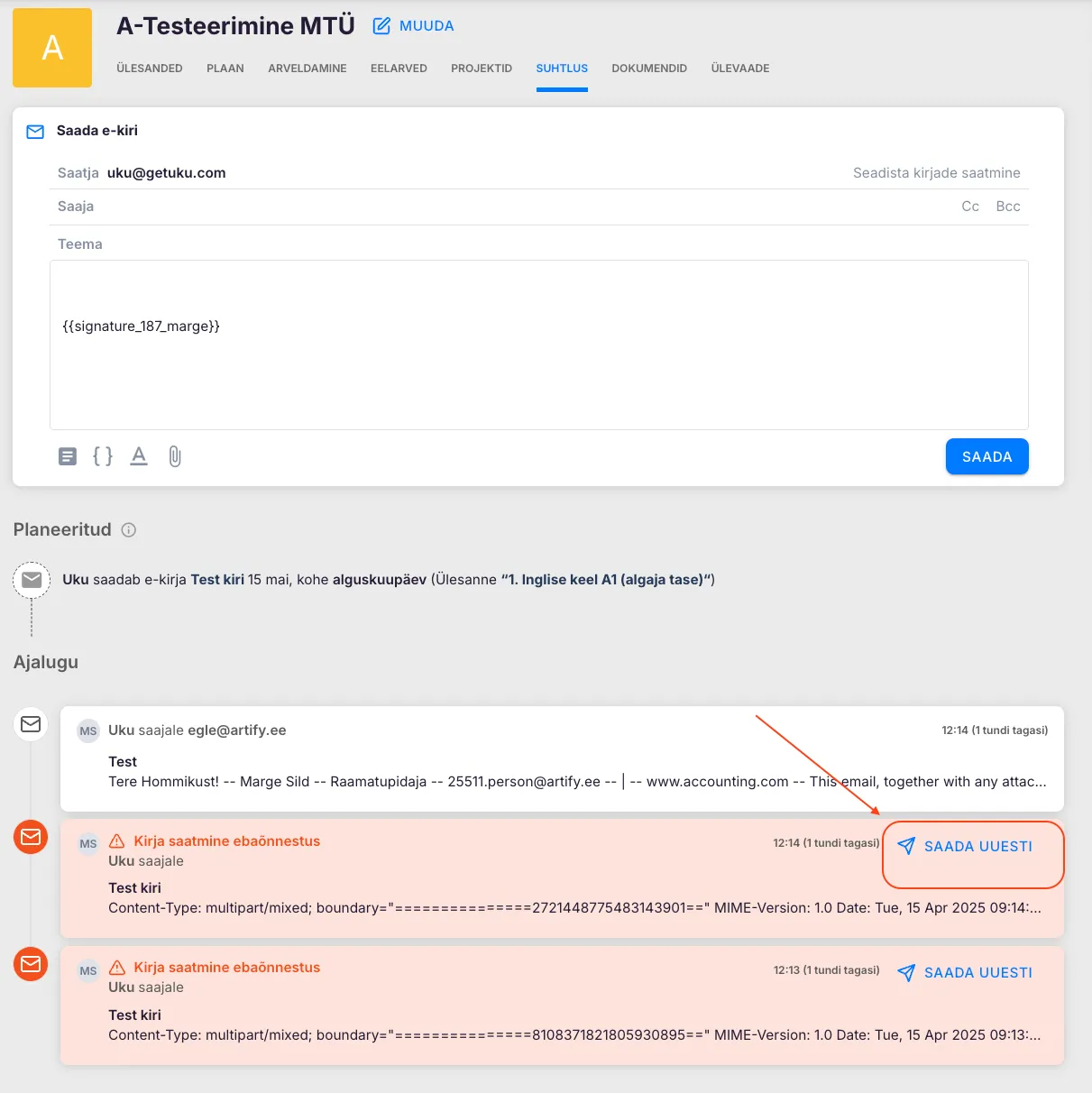 - Klõpsa “Saada uuesti”, kui soovid kirja uuesti välja saata.