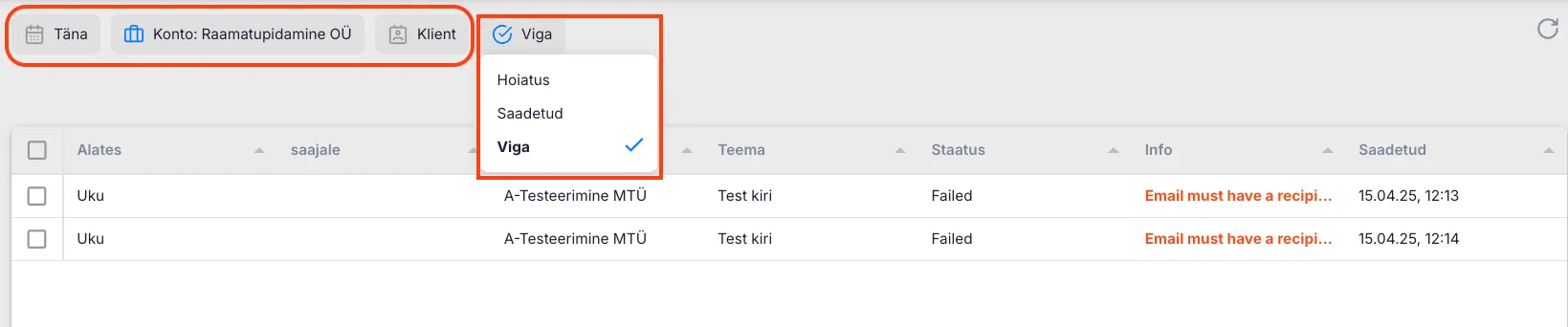 - Viga – kirjad, mis ei läinud välja (nt aegunud integratsioon või vahetunud parool).