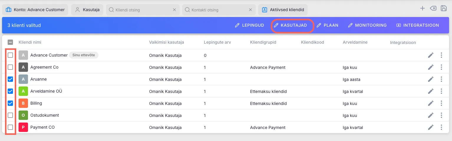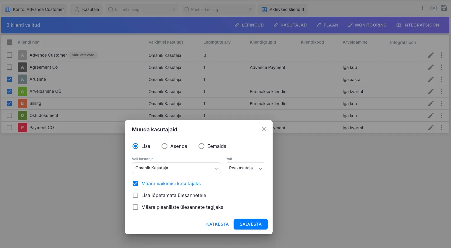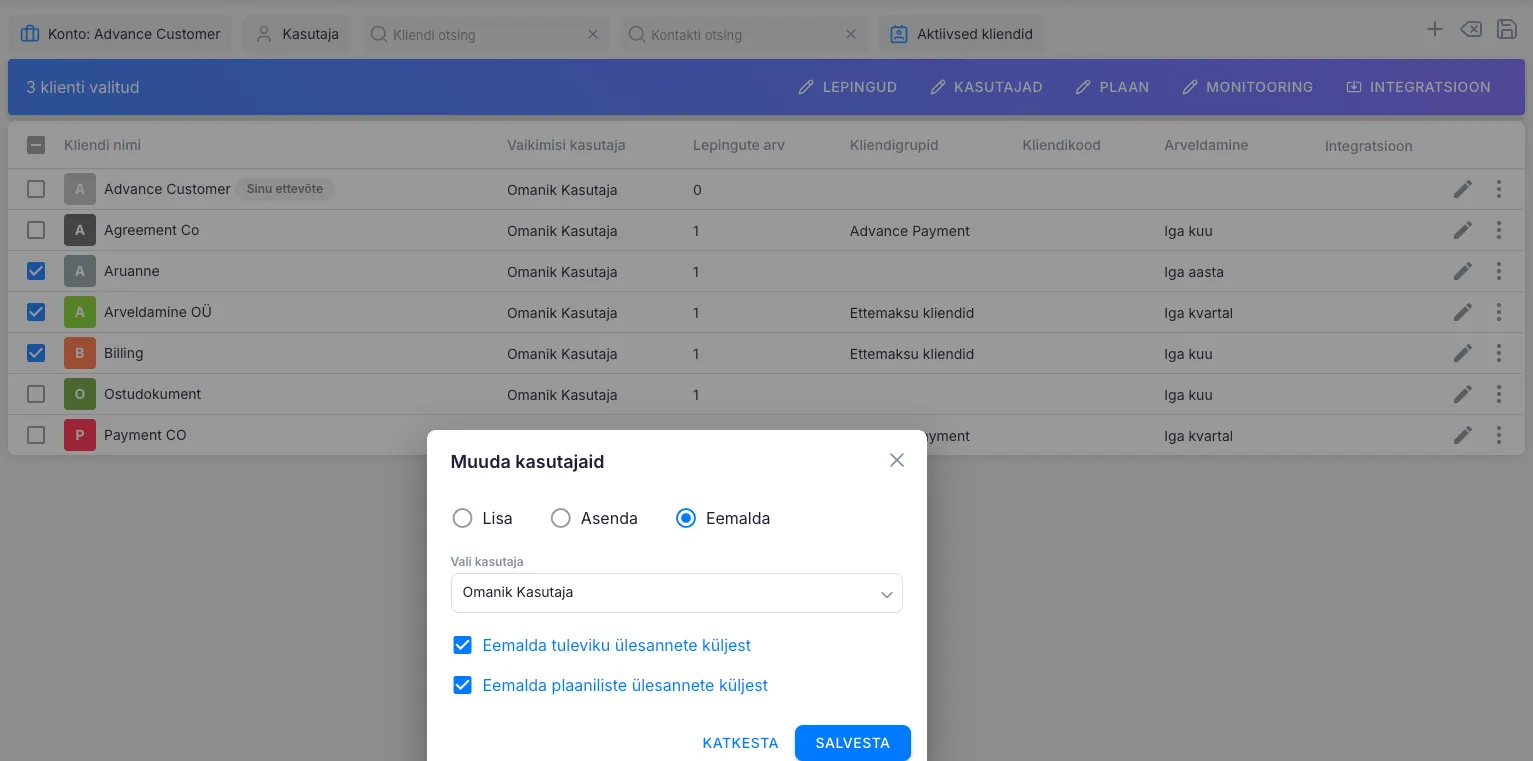 Section titled “Ära raiska väärtuslikku aega kasutajatele üks haaval muudatuste tegemisele”Hulgitoimingud kliendinimekirjas võimaldavad massiliselt teha muudatusi üle kogu kliendibaasi või valitud klientidega. Hulgitoimingutena on võimalik lisada, muuta või eemaldada kasutajaid klientide küljest ning lisada klientidele ülesandeid ettevõtte konto alla loodud tööplaanidest.