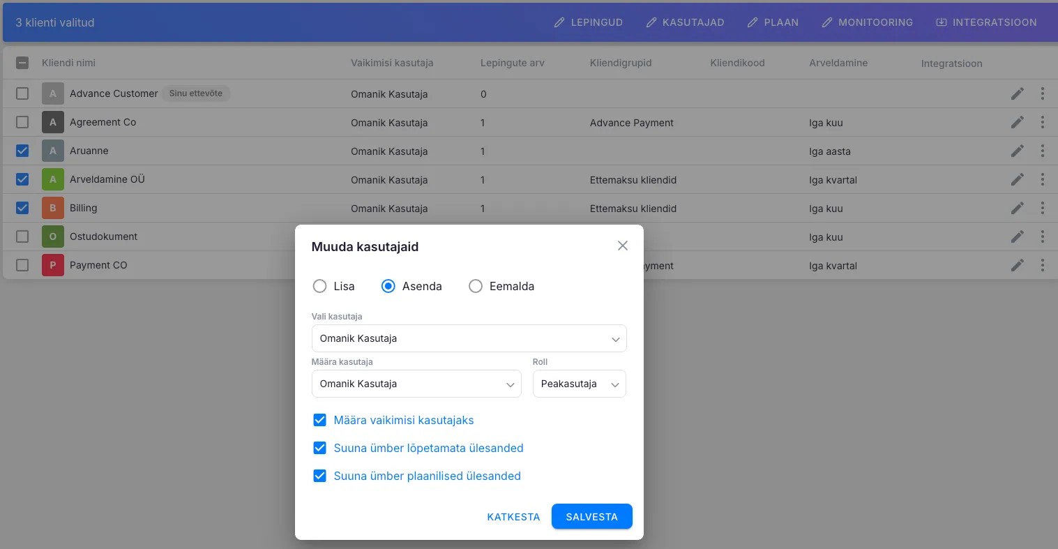 Kasutaja asendamisel vali esmalt, millise kasutaja soovid kliendi küljest eemaldada ning seejärel kellega soovid asendada. Uuele kasutaja saad: