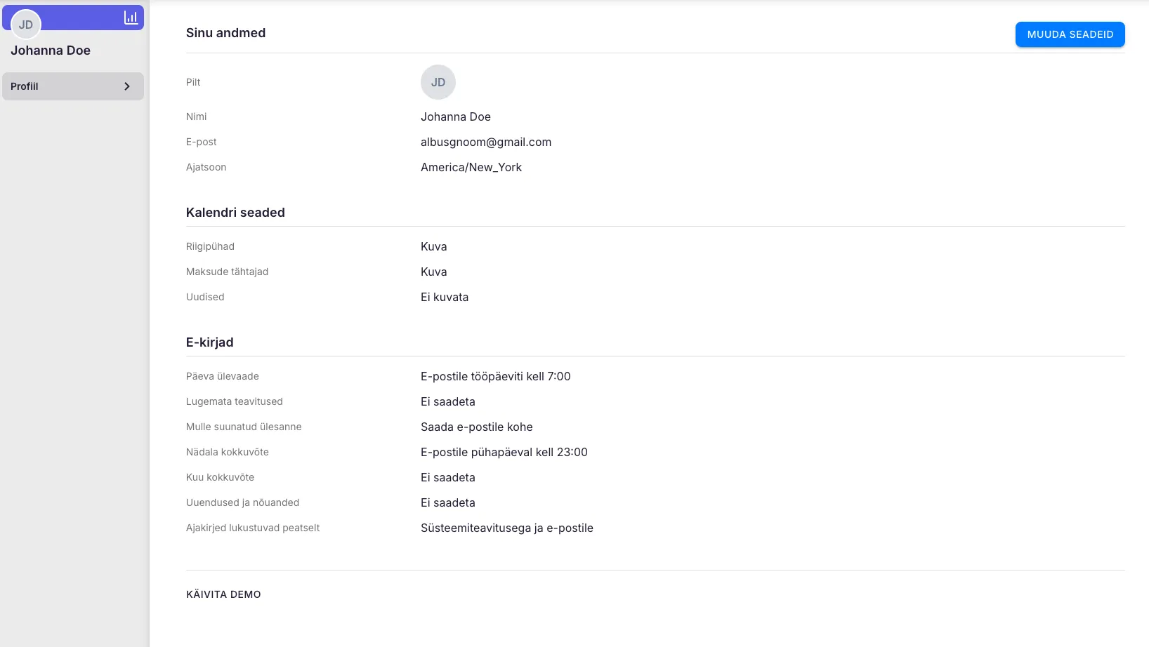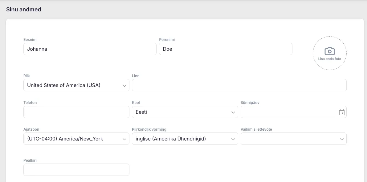 Profiili seadete vaates saad muuta järgmisi isiklikke andmeid: