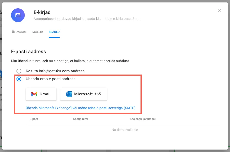Gmaili ja Microsoft 365-ga sidumiseks vajuta vastavale ikoonile, järgi juhiseid ja Uku täidab väljad sinu eest.