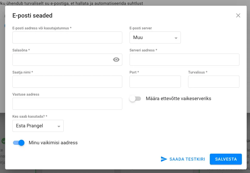 Kui aga soovid ühendada mõne teise e-posti serveri, klõpsa ikoonide all sinisele lingile ja täida väljad käsitsi. Kui kõik väljad on täidetud, vajuta “Saada testkiri”. Kui kõik e-kirjaga on hästi, vajuta “Salvesta”.