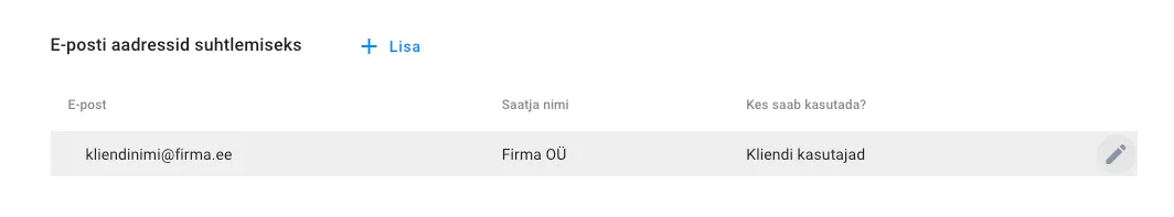 Pliiatsile klõpsates saad muuta e-posti aadressi andmeid, muuhulgas võid määrata selle kliendi vaikimisi aadressiks. Kui see on tehtud, saad sellele kliendile kirju saates valida kirja saatjaks “Kliendi vaikimisi”, mis täidetakse automaatselt aadressiga, mille oled vaikimisi aadressiks määranud.