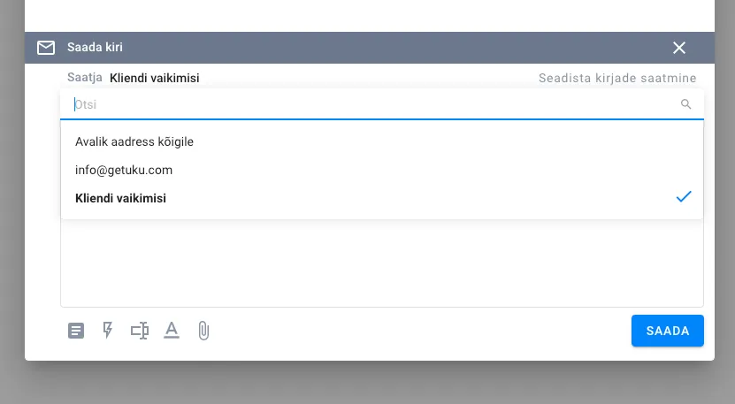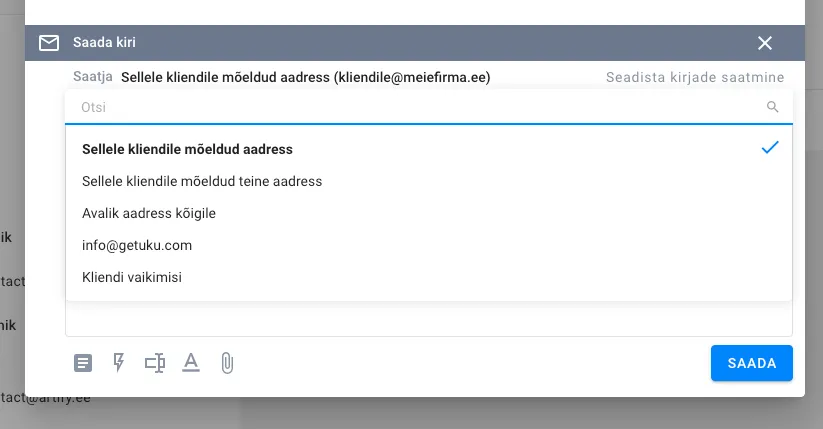 Kui aga avad mõne teise kliendi ülesandes e-kirjade saatmise ploki, näed, et seal on valikus teised saatja aadressid, sest sellele kliendile pole kliendipõhiseid e-kirja aadresse veel lisatud: