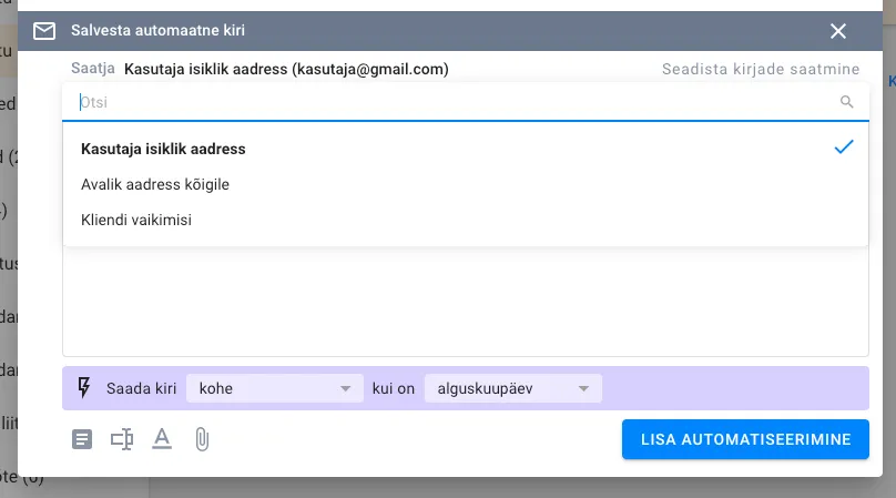 Saatja - Ülesannete malli koostamisel kuvatakse siin valikus kasutaja enda isiklikku meiliaadressi, kõigile kasutamiseks mõeldud meiliaadresse ja valikut “Kliendi vaikimisi”, mis asendatakse kirja saatmisel aadressiga, mis on määratud kliendi vaikeaadressiks.