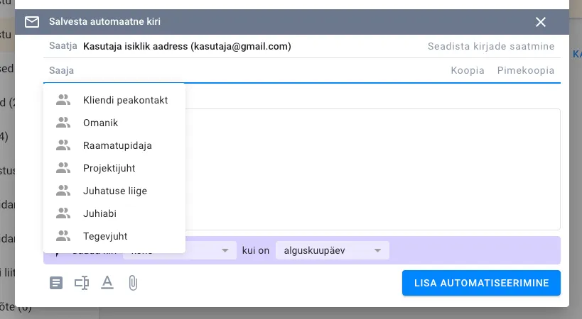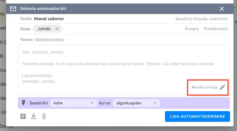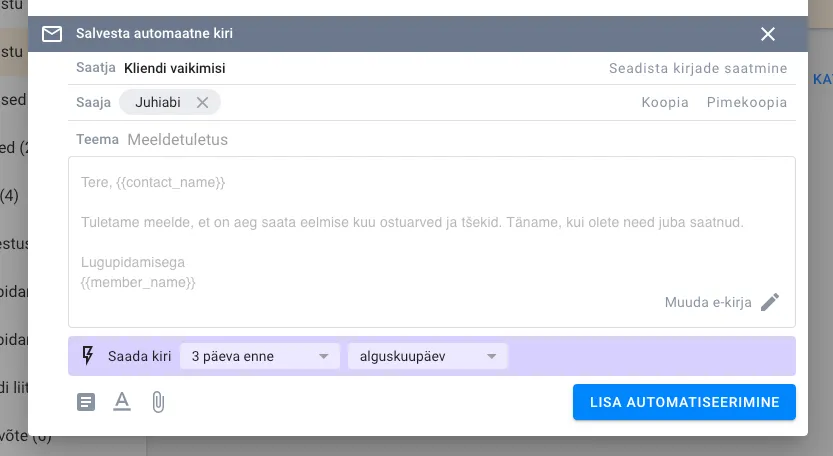 Selleks, et e-kirjade saatmist automatiseerida, tuleb esmalt seadistada e-kirjade äpp. Soovitame eelnevalt luua ka e-kirja mallid, et efektiivsust veelgi tõsta.