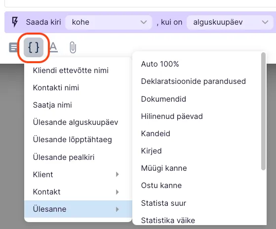 Lisa kirja teksti erinevad muutujad, kasutades kliendi, kontakti, projekti või ülesande välju e-kirjades.
