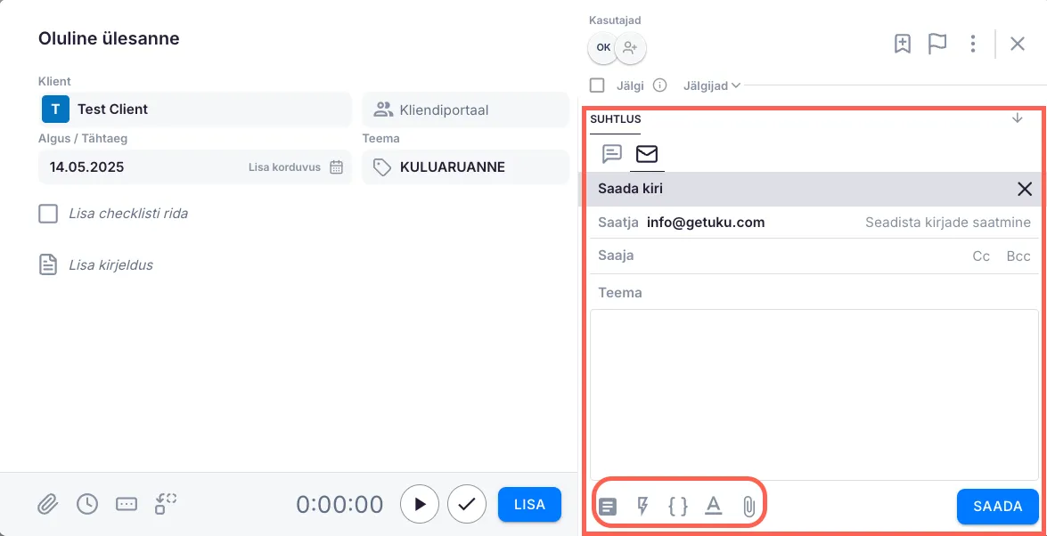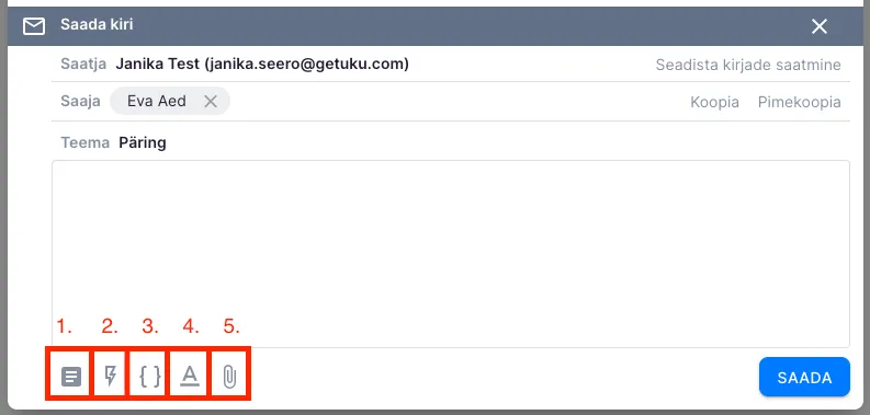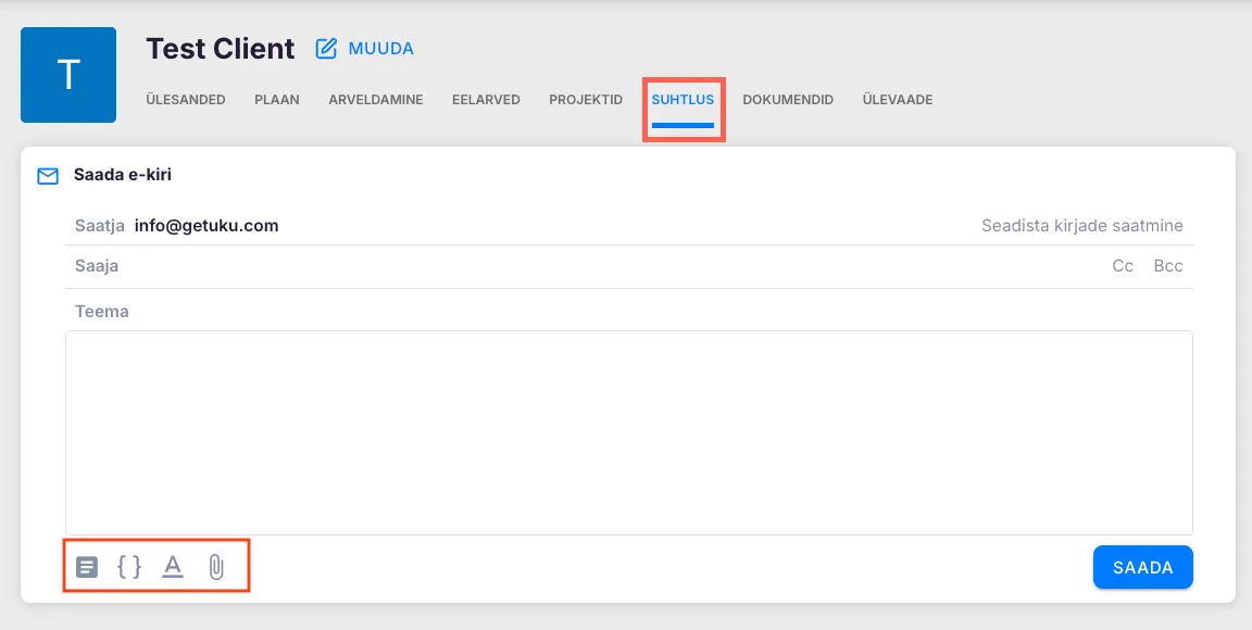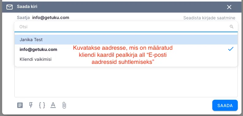 Saatja aadressi saad valida rippmenüüst. Valik sõltub sellest, millised e-posti aadressid oled seadistanud. Kuvatakse just sellele kliendile lisatud meiliaadresse, ettevõtte avalikke aadresse, info@getuku.com ning valikut “Kliendi vaikimisi”. Viimase valimisel asendatakse see automaatselt kliendi vaikimisi e-posti aadressiga. Selle saad määrata kliendikaardil, kui avad plokis “E-posti aadressid suhtlemiseks” meiliaadressi ja määrad selle vaikeaadressiks.