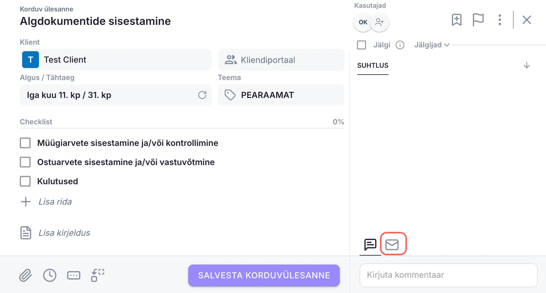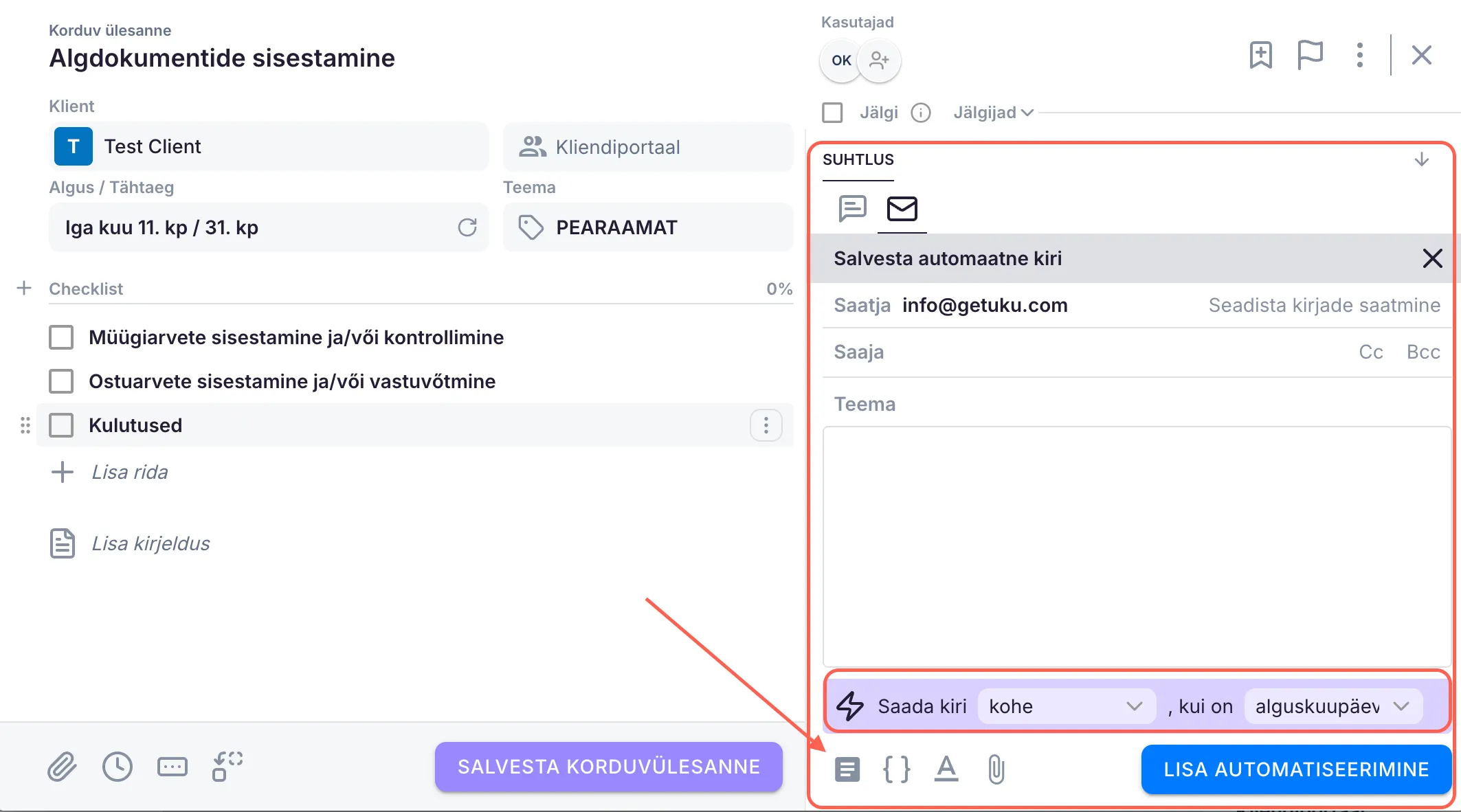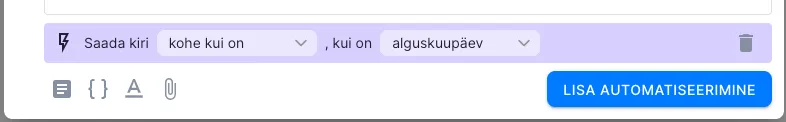Lisa automatiseerimine - Korduvülesannetele on hea lisada automaatselt saadetavad kirjad. Automatiseerimisel saad valida, kas kirja saatmine sõltub selle ülesande alguskuupäevast, tähtajast või lõpetatuks märkimisest. Samuti saad määrata, kas kiri saadetakse kohe või 1-3 päeva enne või pärast määratud aega. Kiri saadetakse välja määratud kuupäeval kell 8 hommikul saatja ajatsooni järgi. Kui kiri peaks välja saadetama samal päeval, kui kirja lisad, saadetakse see kohe, aga mitte hiljem kui kell 23.00.