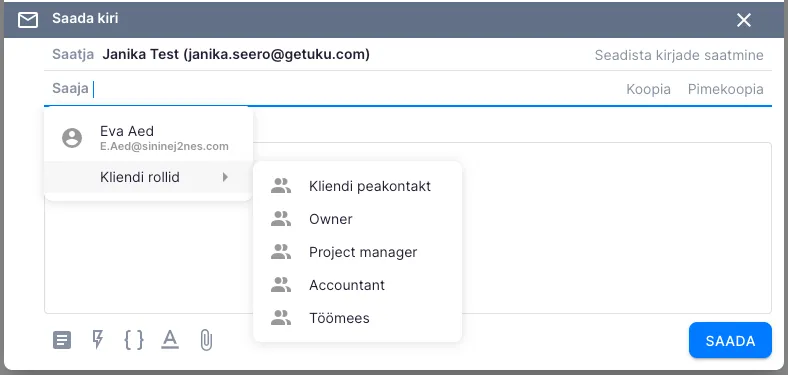 Saaja meiliaadressi võid sisestada ise või valida kliendi kontaktide ja rollide seast. Kui valid rolli, saadetakse kiri meiliaadressile, mis on lisatud kliendi kontaktile, kes on selles rollis.