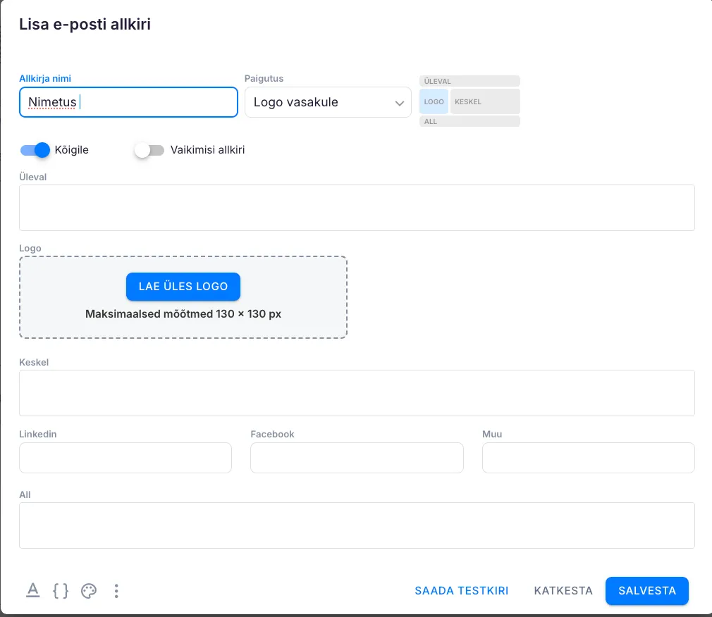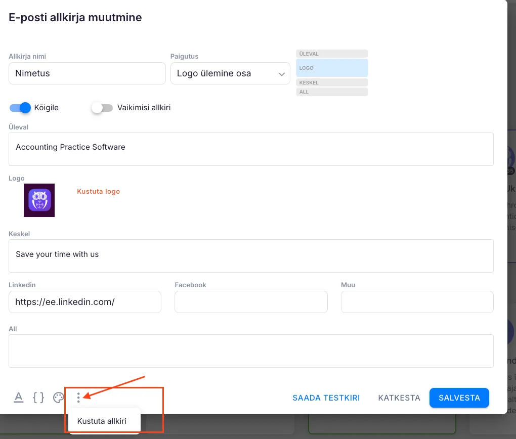 Avaneb allkirja seadistuste aken. Tee oma muudatused ja klõpsa “Salvesta”.