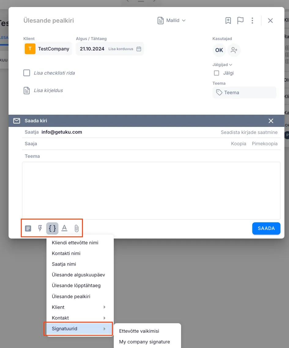 Section titled “Allkirja kasutamine”- Ava ülesanne, kus soovid e-kirja lisada.