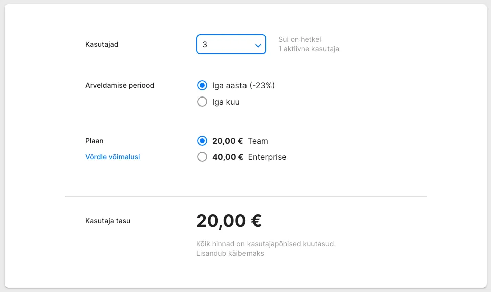 Pane tähele: kasutajate arvu vähendamisel juba tasutud summat ei tagastata.