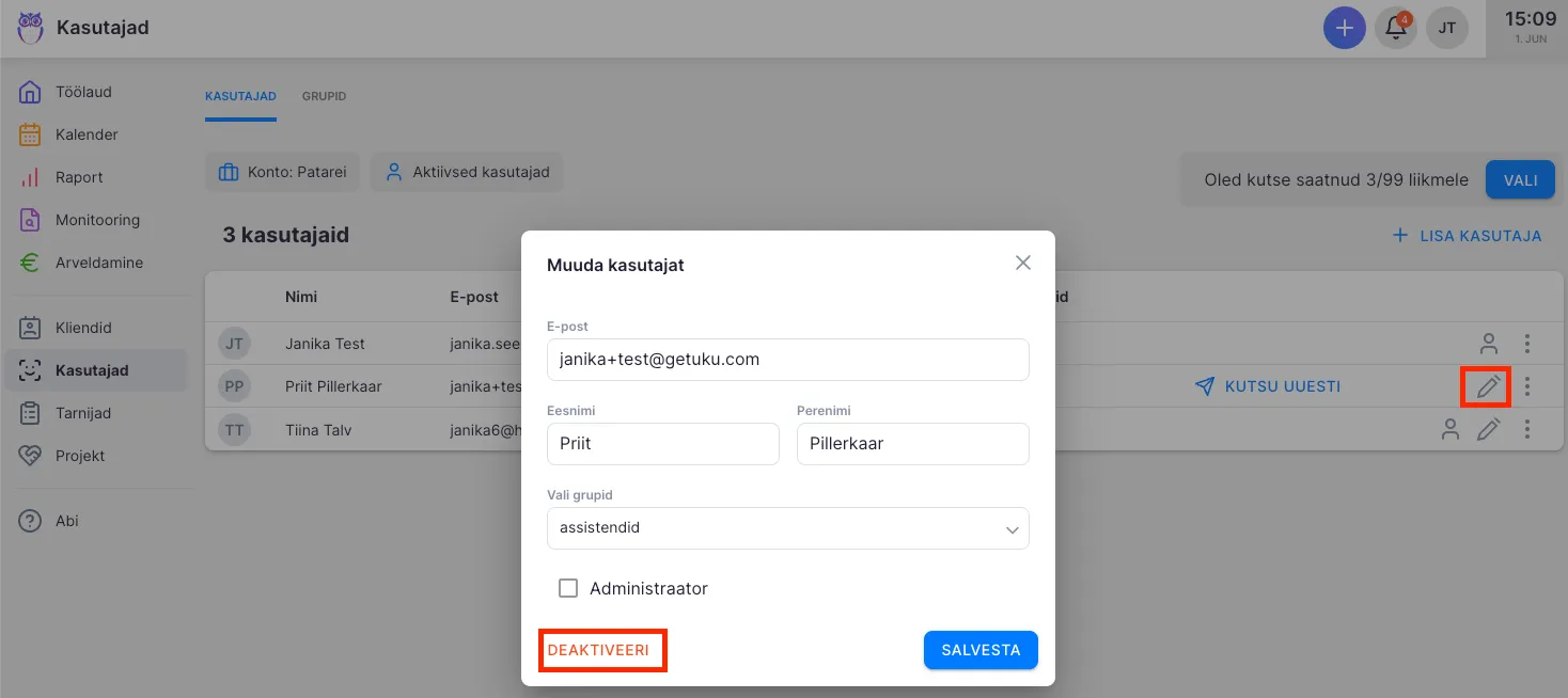 Kui keegi lahkub ja tema kontot pole enam vaja, saad kasutajate arvu vähendada järgmiselt: Ava menüüst “Kasutajad” ja tee lahkuv kasutaja mitteaktiivseks. Selleks otsi nimekirjast sobiv kasutaja, klõpsa pliiatsi ikoonile ning vali “Deaktiveeri”.