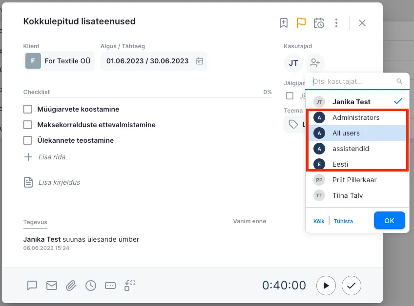 Kasutajate puhul võetakse arvesse ka kasutajagruppidesse kuulumist. Näiteks kui tiimiliige Merike kuulub “Assistendid” gruppi, siis tema nime järgi filtreerides kuvatakse lisaks Merikese ülesannetele välja ka grupi “Assistendid” ülesanded.