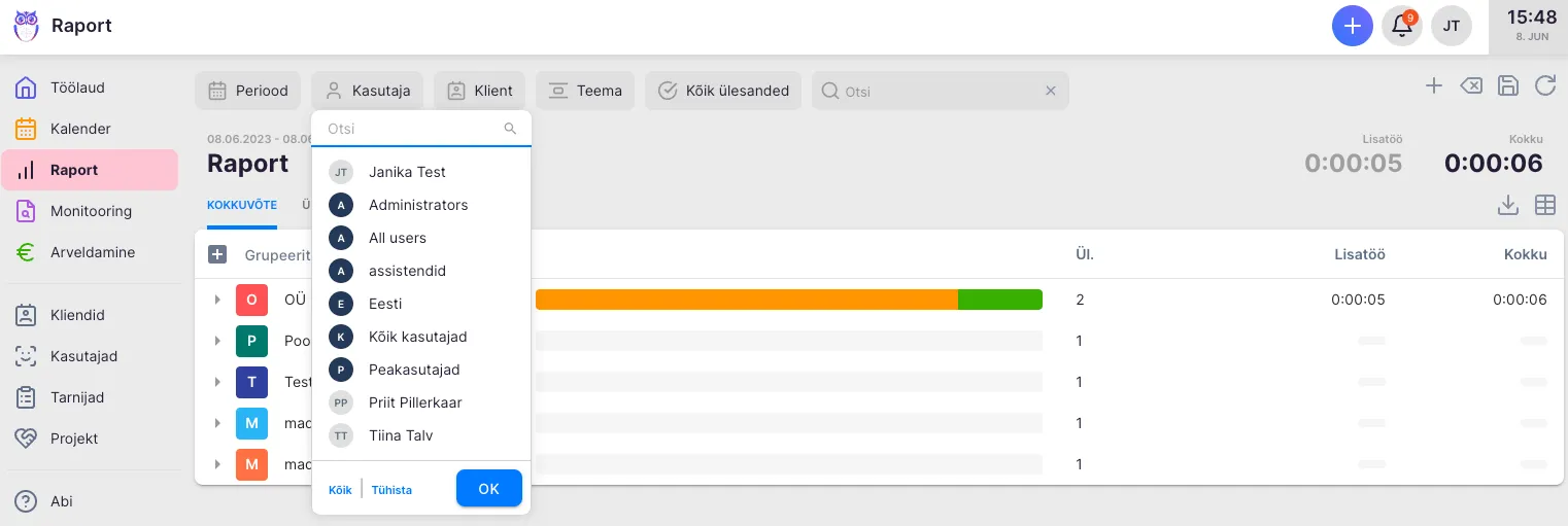 Section titled “3. Kasutajagruppide järgi filtreerimine”Sorteeri andmeid “Kasutaja” filtris. Kasutajate infot saad selekteerida kasutajagruppide kui ka kasutajate järgi. Nii saad töötajad näiteks kliendivaldkondade, kogemuse või muu näitaja põhjal gruppidesse lisada ja erinevate meeskondade tööviljakust analüüsida.