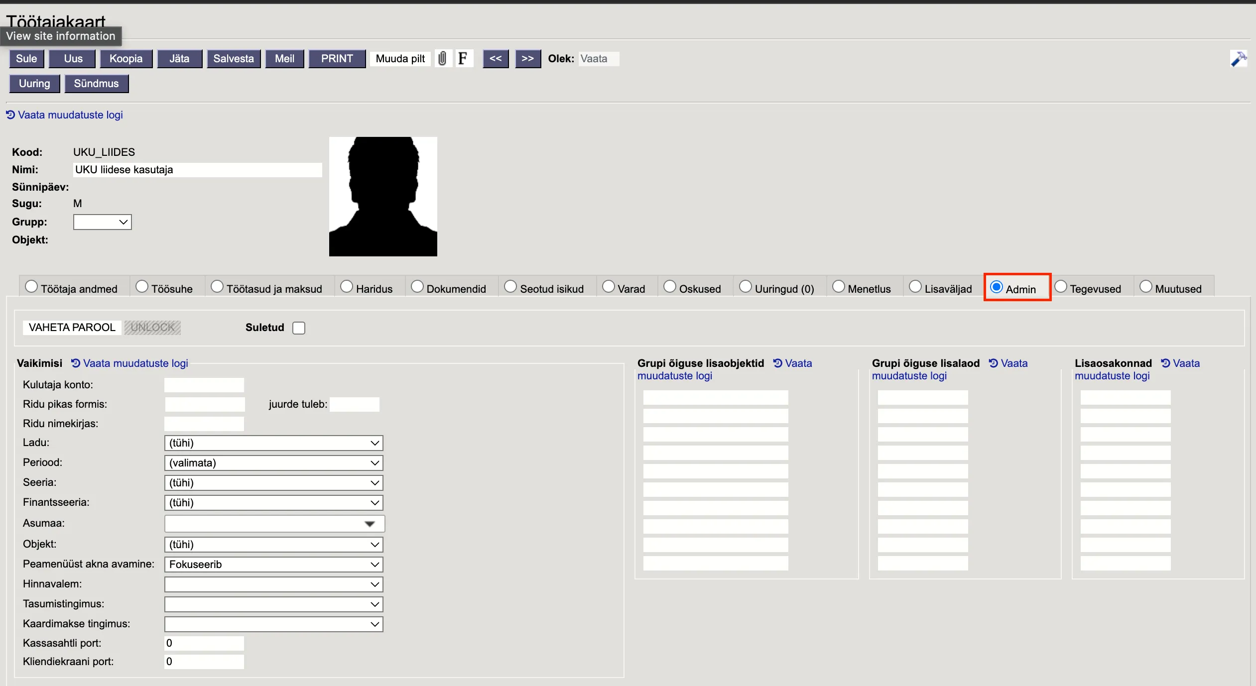 Töötajakaardilt ‘Admin’ valik.