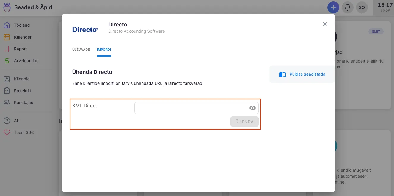 Sisestage Ukus Directo äpi all XML Direct võti ja ühendage, mis käivitab kliendiimpordi.