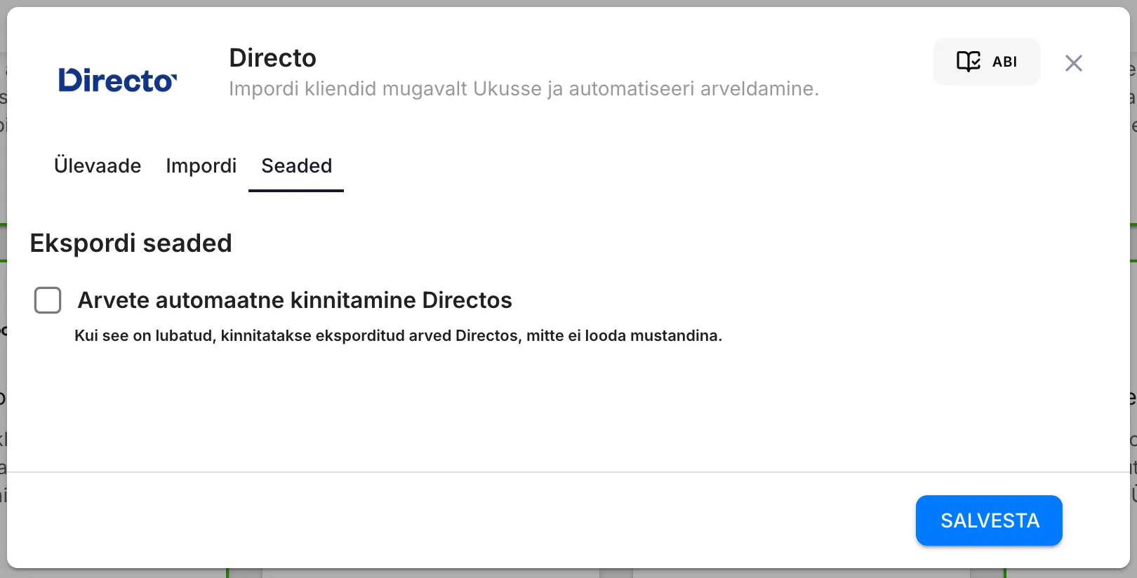 - Arvete automaatne kinnitamine — kui see on sisse lülitatud, kinnitatakse eksporditud arved Directos automaatselt. Kui välja lülitatud (vaikimisi), luuakse arved Directos mustanditena.
